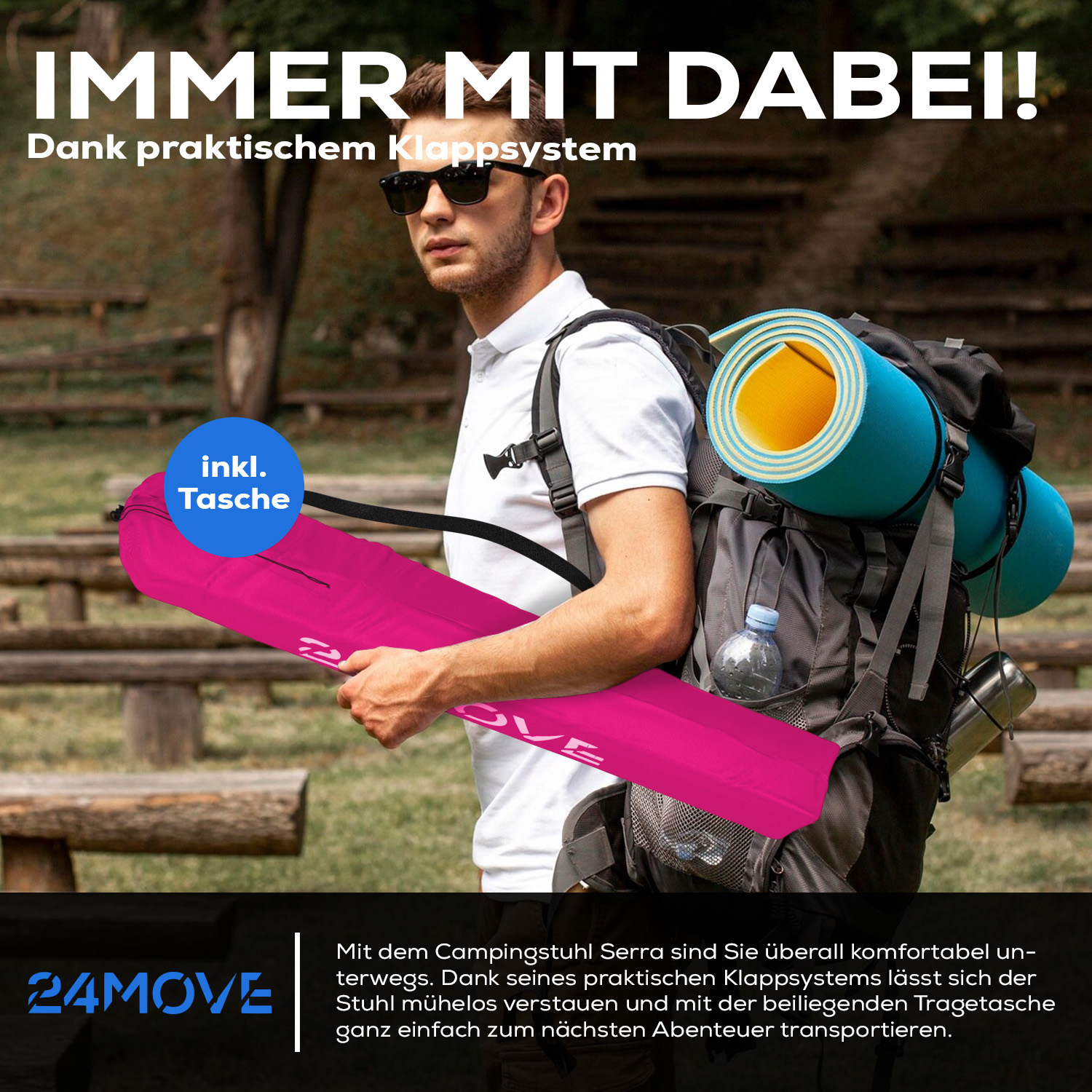 24MOVE® Campingstuhl faltbar,Anglerstuhl,Liegestuhl mit Getränkehalter, pink