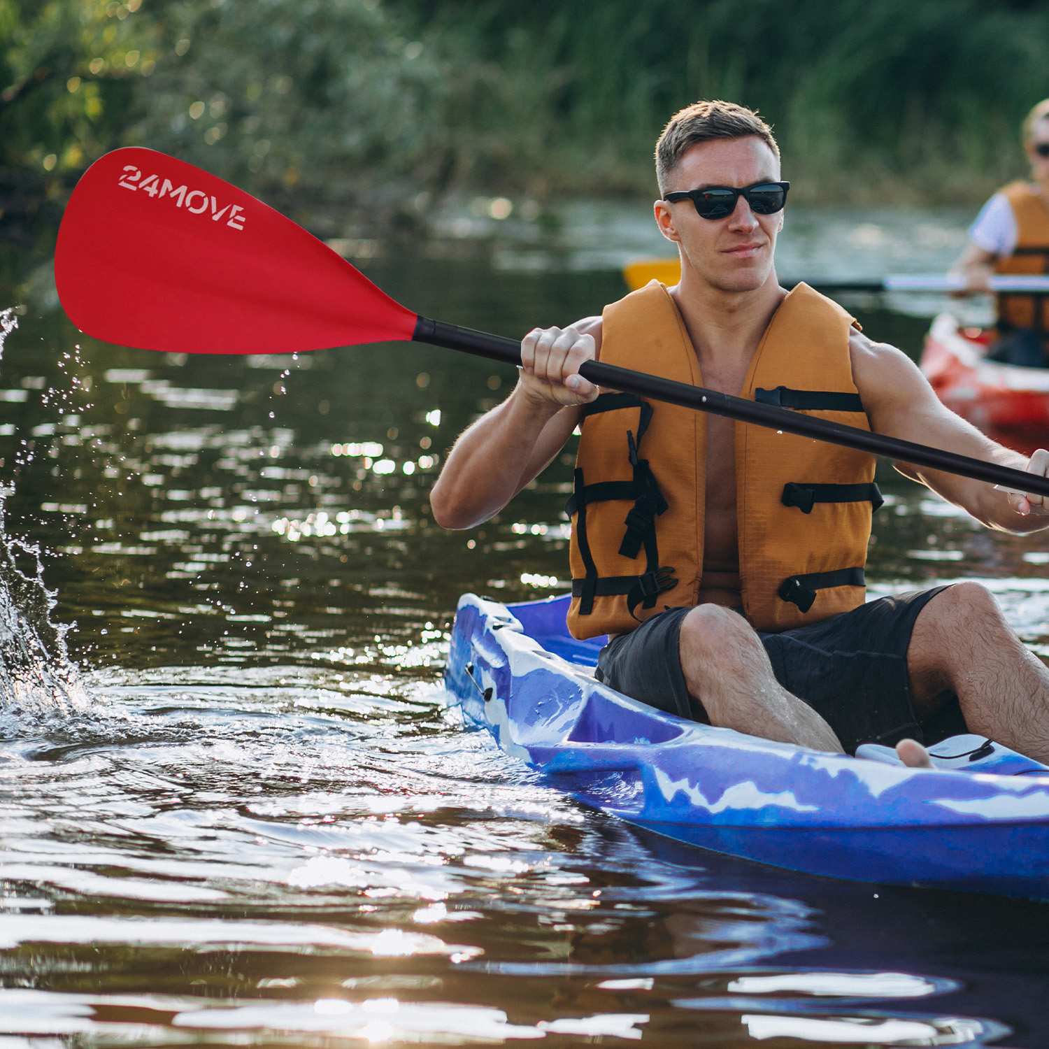 Das orange 24MOVE Doppelpaddel besteht aus Aluminium, Glasfaser und Polyethylen, was für eine stabile und langlebige Struktur sorgt. Mit seinen großzügigen Paddelblättern von ca. 840 cm² gleiten Sie spielend leicht über die Wasseroberfläche.