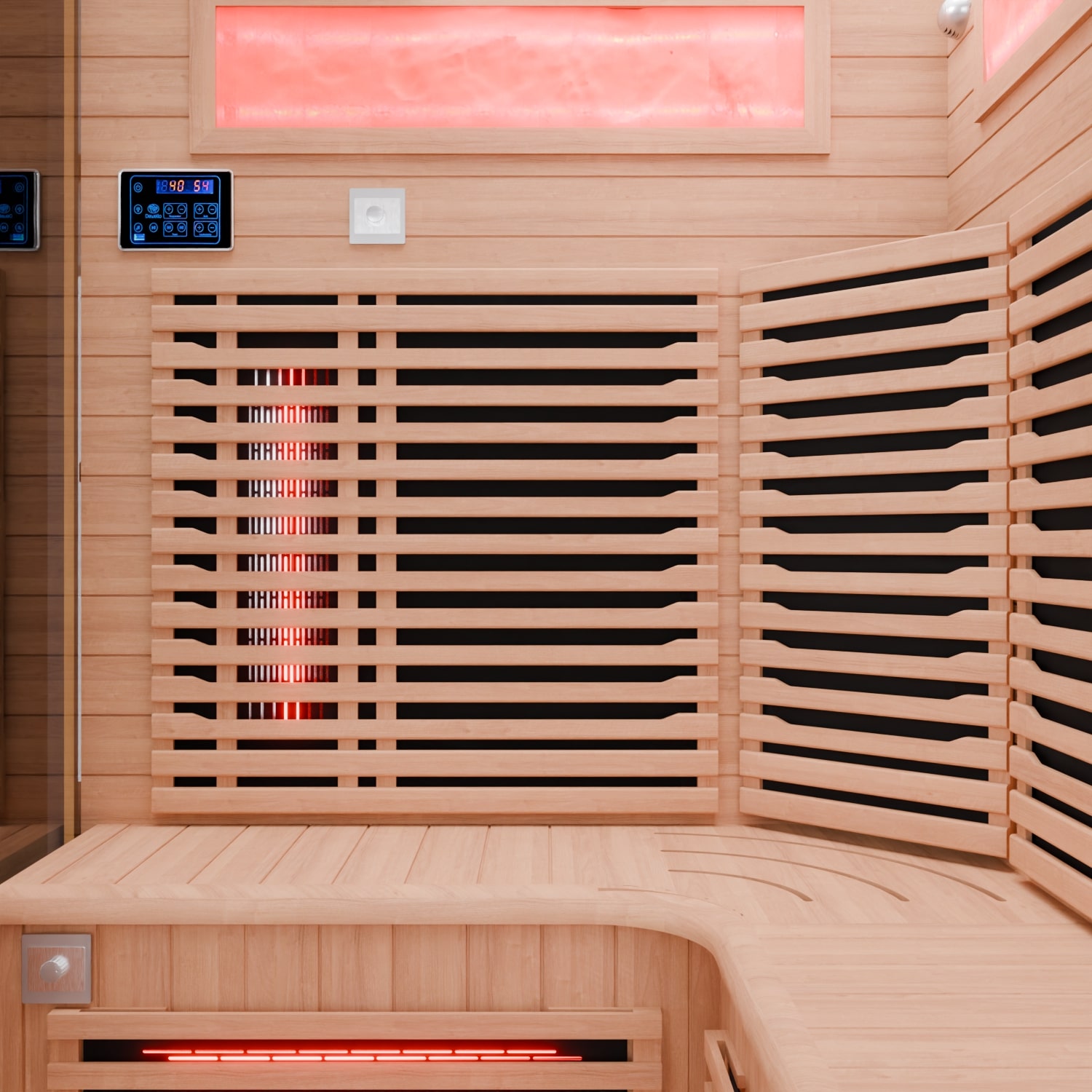 In der Kabine sind 7 hochwertige Vollspektrumstrahler und 4 Karbon-Flächenstrahler verbaut, die für eine gleichmäßige und intensive Tiefenwärme sorgen. Die Vollspektrumstrahler bieten den Vorteil, dass sie sofort nach dem Einschalten Wärme abgeben, ohne lange Aufheizzeiten. Der zusätzliche Bodenstrahler sorgt dafür, dass auch die Füße während der Nutzung optimal gewärmt werden. So entsteht ein ganzheitliches Wärmeerlebnis, das für eine entspannende Atmosphäre sorgt.