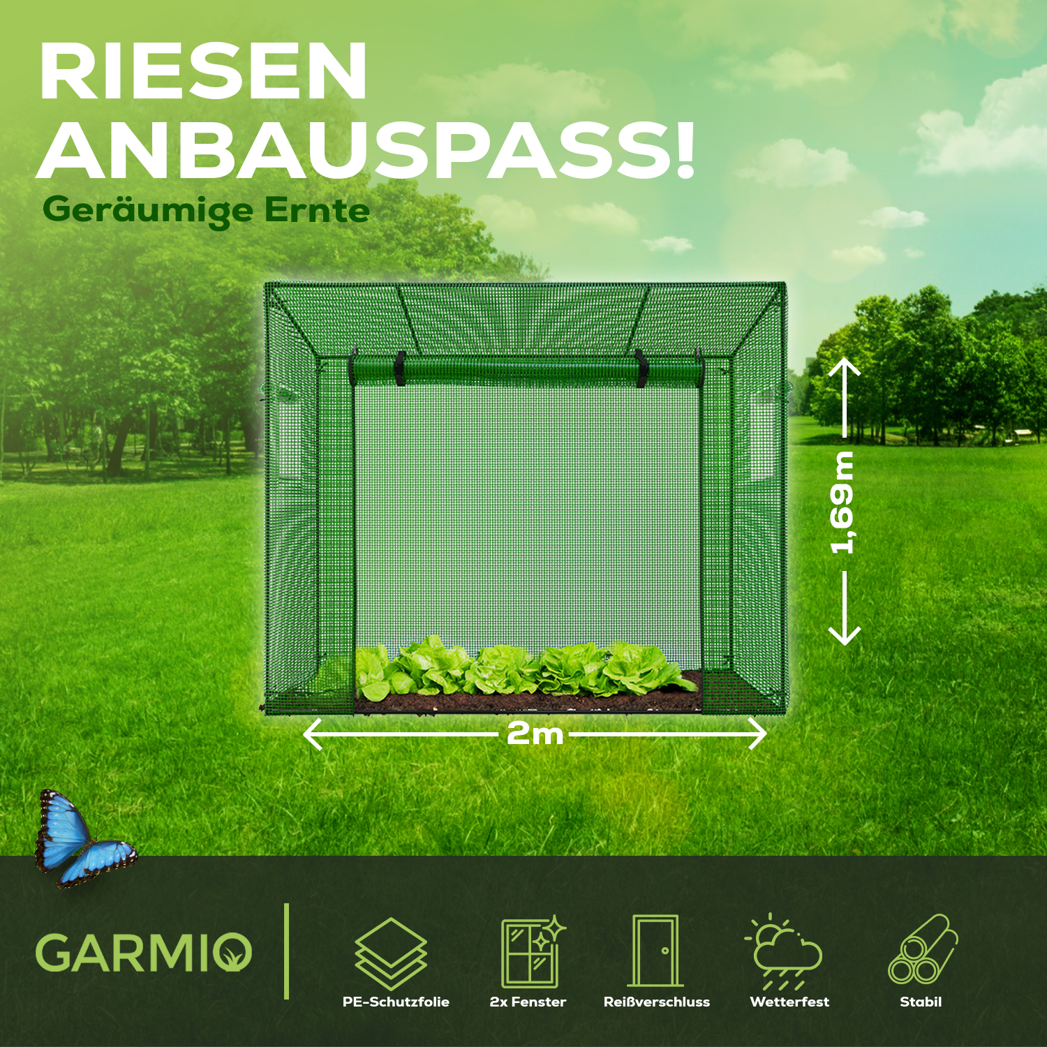 Hochwertige Materialien: Ein solides Gestell und eine widerstandsfähige UV-stabile Folie bilden die Grundlage für eine Struktur, die den Herausforderungen der Natur standhält.