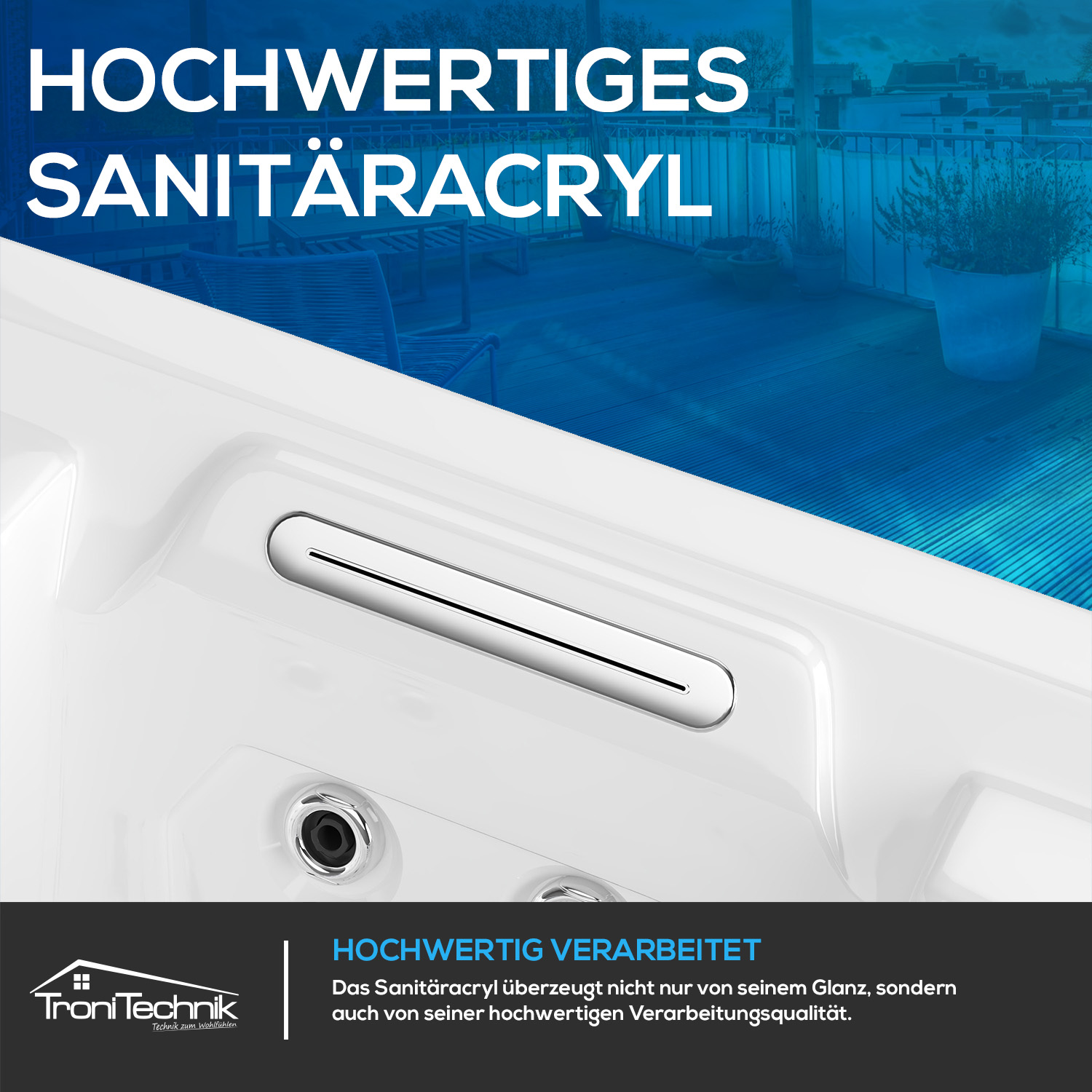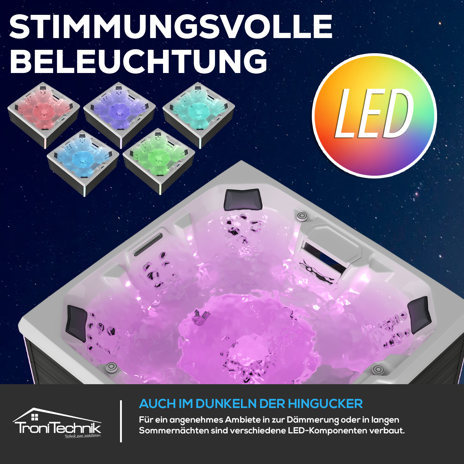 Auch optisch sind unsere Outdoor-Whirlpools ein echtes Highlight. Wählen Sie aus verschiedenen Designs und Größen, die sich harmonisch in Ihre Umgebung einfügen – ganz gleich, ob im Garten, auf der Terrasse oder am Pool. Integrierte LED-Lichteffekte schaffen abends eine stimmungsvolle Atmosphäre und machen jede Nutzung zu einem besonderen Erlebnis.