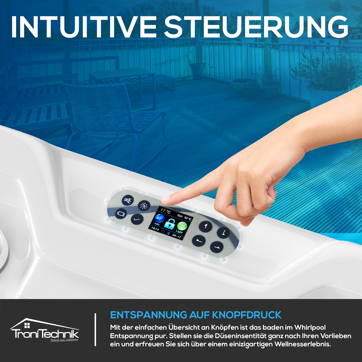 Die intuitive Steuerung erlaubt Ihnen, alle Funktionen bequem zu regulieren – von der Wassertemperatur bis zur Intensität der Massage. Und dank selbstreinigender Filtersysteme bleibt Ihr Whirlpool nicht nur sauber, sondern auch hygienisch einwandfrei – bei minimalem Wartungsaufwand.