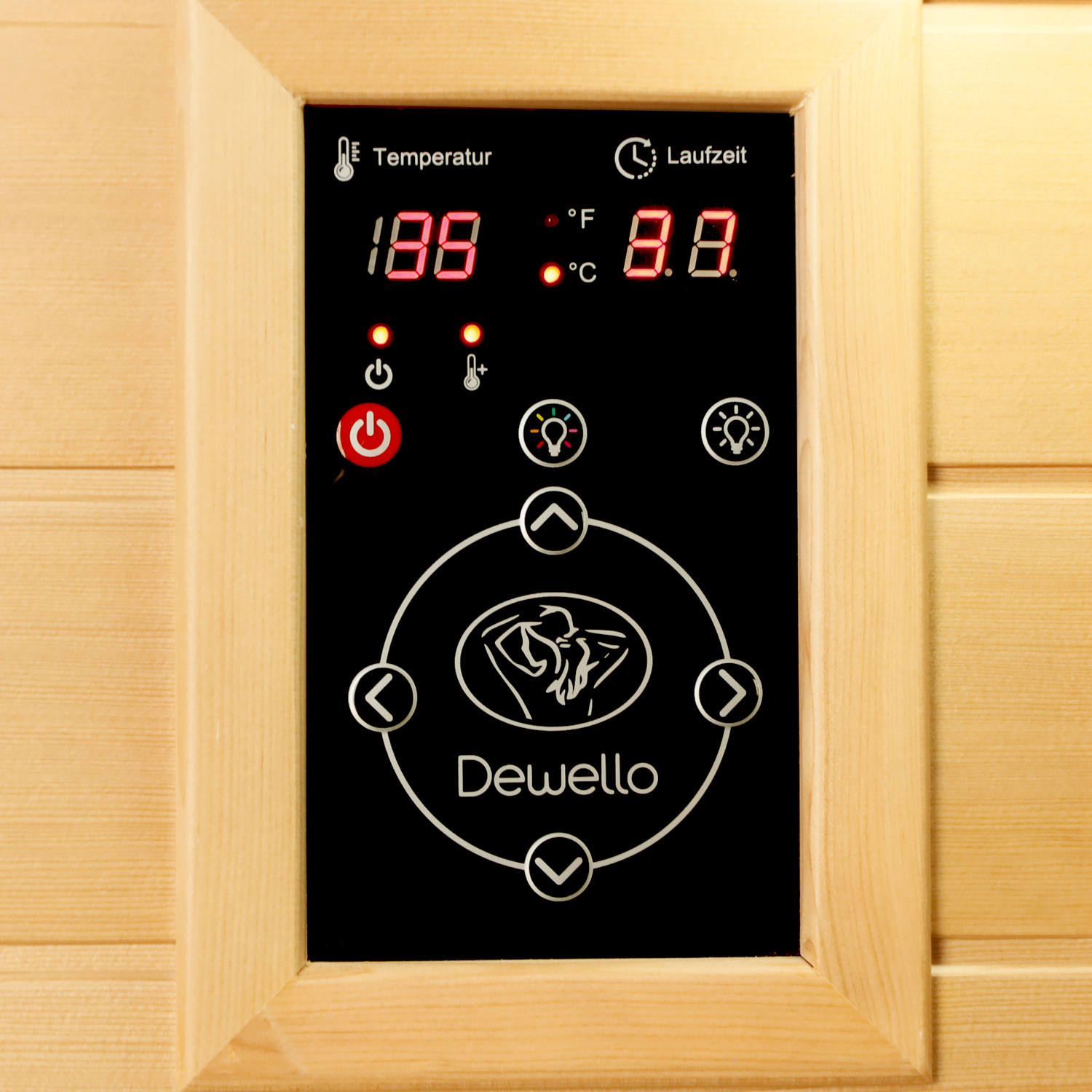 Sechs Infrarotstrahler verteilen die Wärme optimal in der Kabine. Fünf Keramikstrahler im Rücken-, Bein- und Frontbereich sowie ein Karbon-Flächenstrahler im Boden erzeugen eine gleichmäßige Tiefenwärme. Die Temperatur ist flexibel von 30 °C bis 65 °C einstellbar und kann individuell an das persönliche Wärmeempfinden angepasst werden.