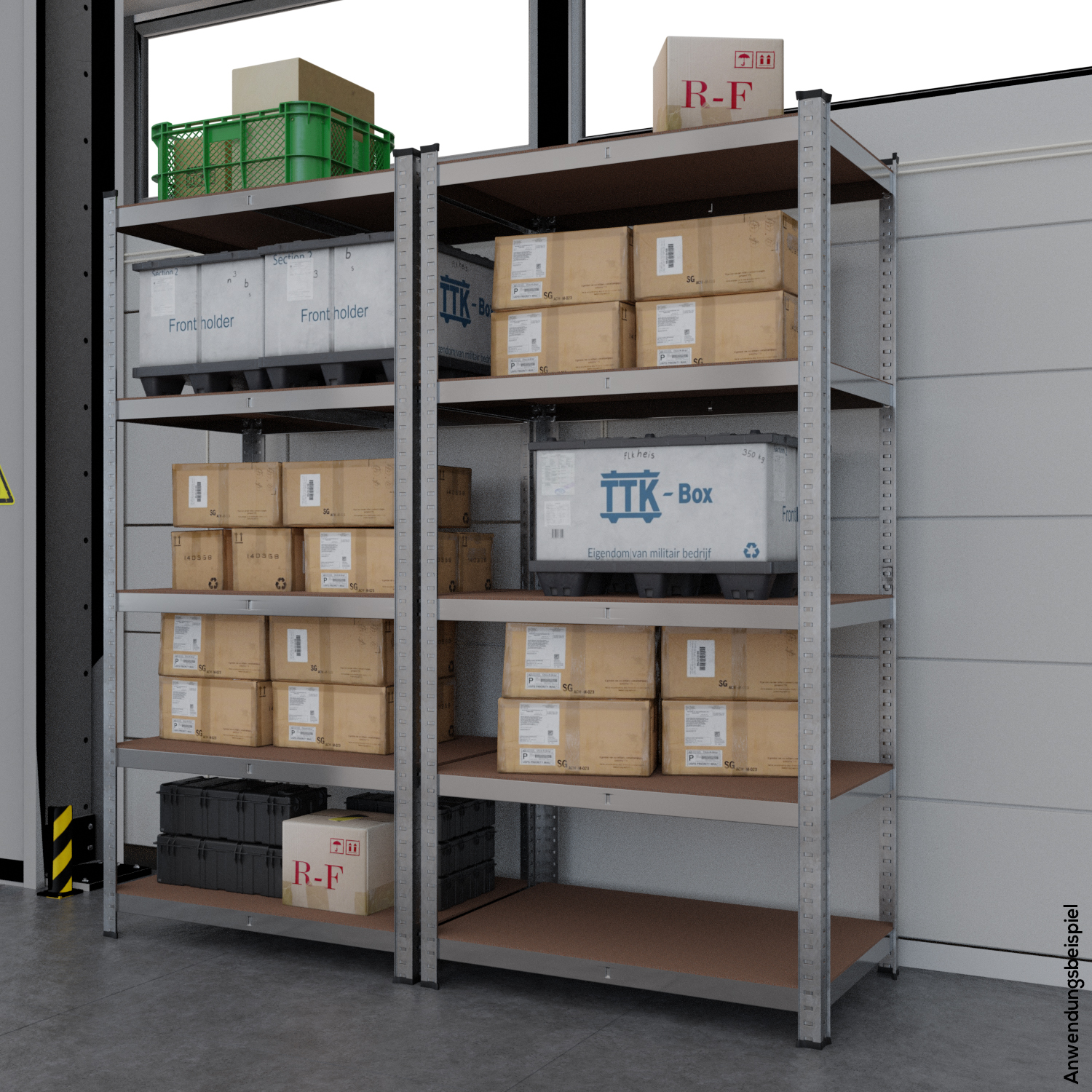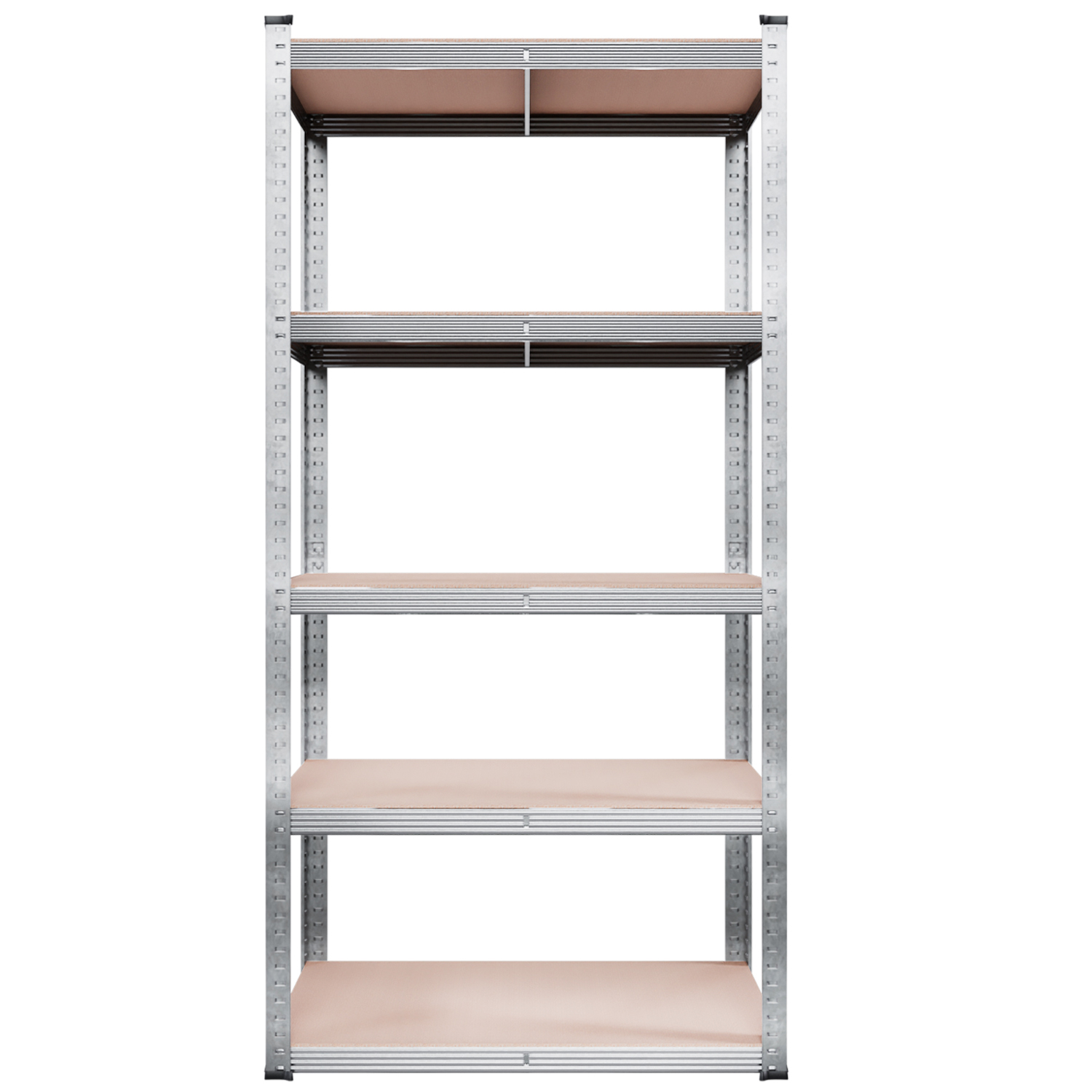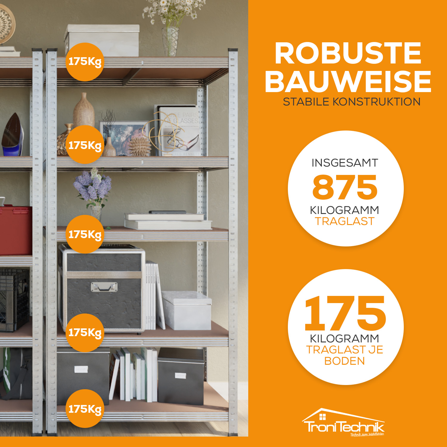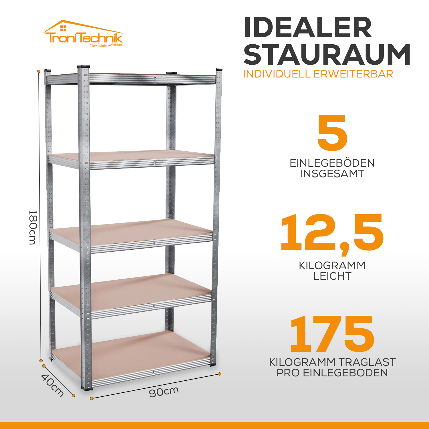 - Jeder Regalboden trägt bei gleichmäßiger Belastung bis zu 175 kg – insgesamt ergibt sich damit eine Tragfähigkeit von 875 kg.