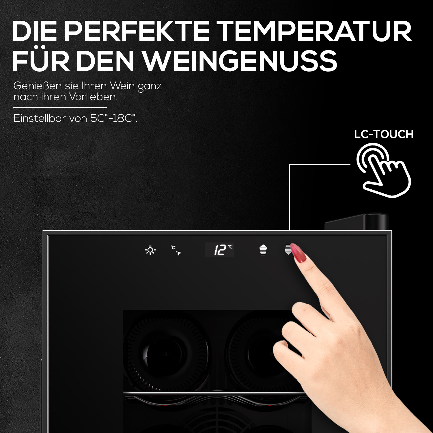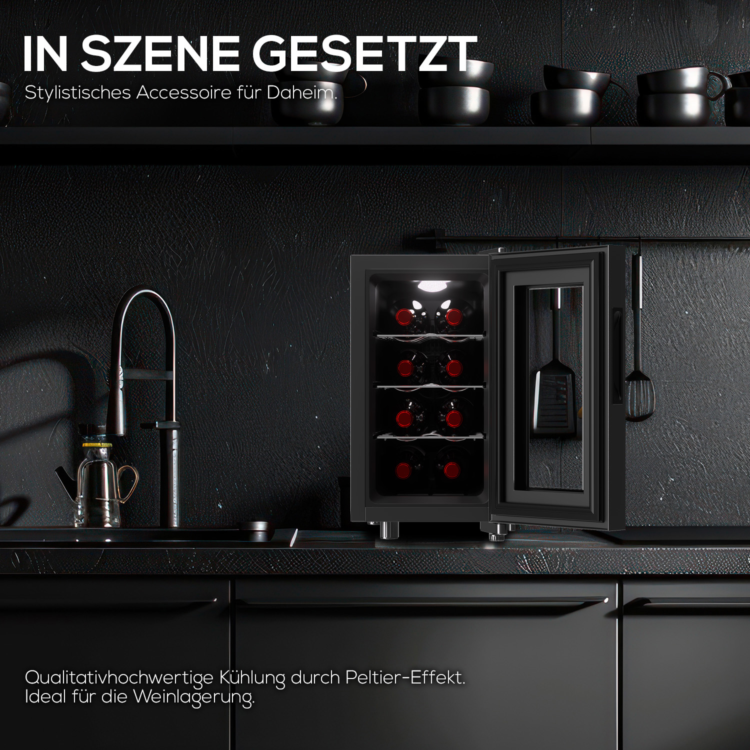 Dieser Weinkühlschrank ist nicht nur funktional, sondern auch ein optisches Highlight. Das elegante Gehäuse und die LED-Innenbeleuchtung präsentieren Ihre Weinsammlung auf stilvolle Weise. Die angeordneten Böden bieten Platz für bis zu 12 Flaschen und sind leicht ausziehbar, um den Zugriff zu erleichtern.